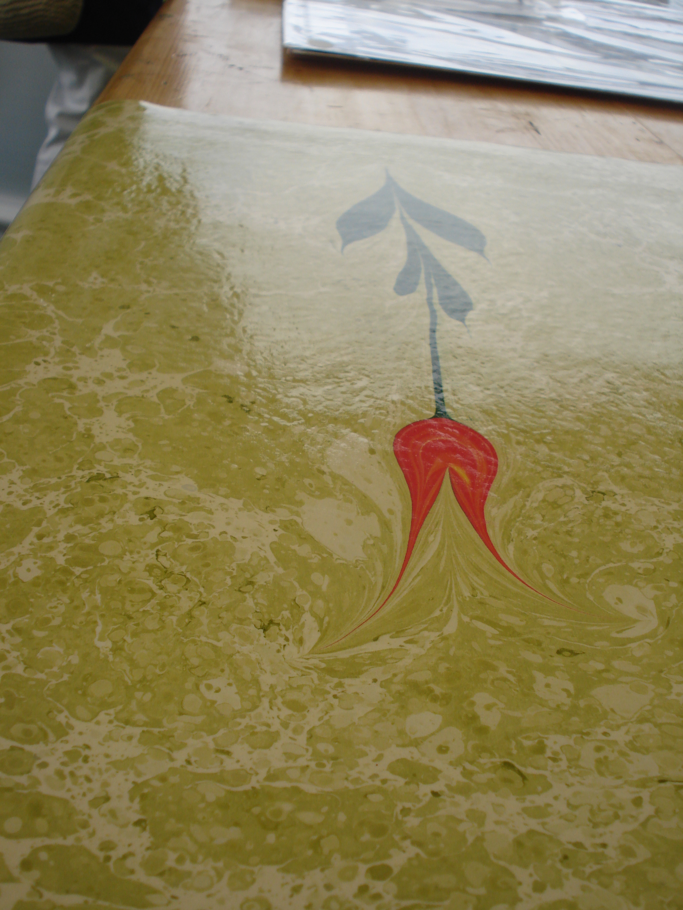 In this style, a new design of marbling is used on already produced and dried Ebru paper. If necessary, more than two designs can be made on the same paper.