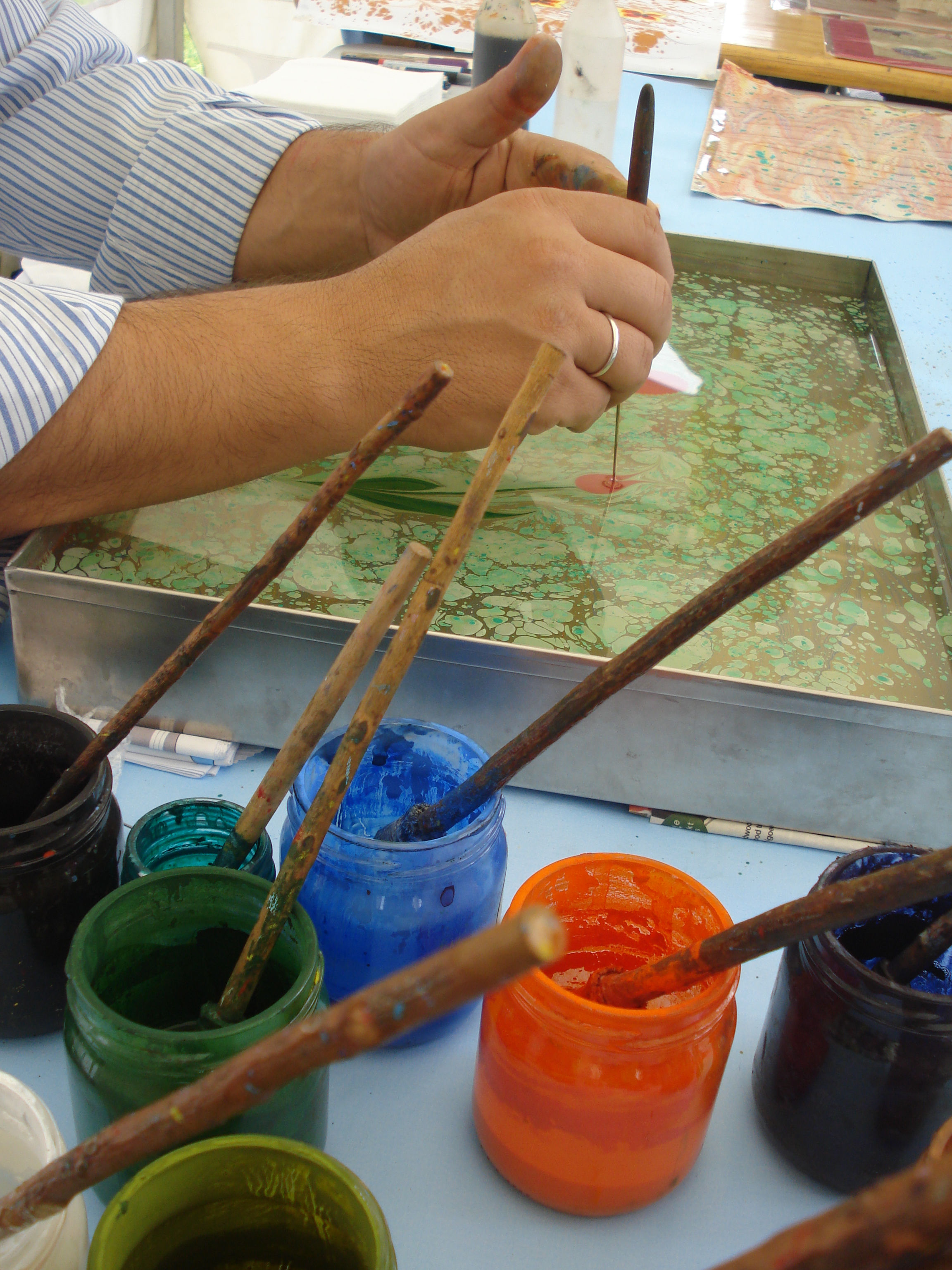 Brushes traditionally used in Ebru are made of horsehair and rose branches. It is possible to control the amount of dye to sprinkle by using appropriate brushes with different thickness and length.